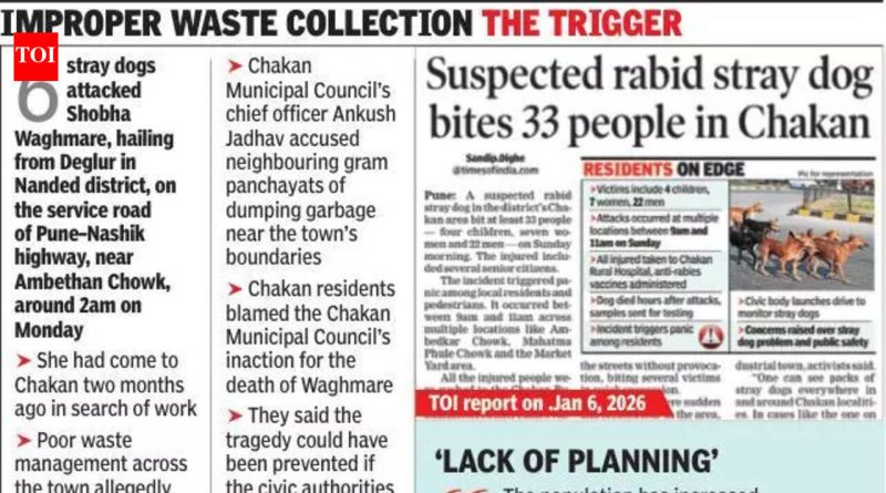 पपुणे : औद्योगिकनगरीत सोमवारी पहाटे एका महिलेचा मृत्यू झाल्याचा वारंवार इशारा देऊनही चाकण नगरपरिषदेच्या भटक्या कुत्र्यांवर कारवाई होत नसल्याचा आरोप रहिवासी आणि कार्यकर्त्यांनी केला.रहिवाशांनी असा दावा केला की या वर्षाच्या सुरुवातीला एका संशयित भ्याड कुत्र्याने अनेकांना चावल्यानंतर नागरी अधिकाऱ्यांनी कठोर उपाययोजना केल्या असत्या तर ही शोकांतिका टाळता आली असती. TOI ने 6 जानेवारी 2026 च्या आवृत्तीत या घटनेचा अहवाल प्रकाशित केला होता.चाकणमधील कार्यकर्ते मयूर मुंगसे म्हणाले, “एक संशयित रेबीज-संक्रमित कुत्र्याने 5 जानेवारी रोजी शहरातील किमान 33 लोकांना चावा घेतला होता. हा अधिकाऱ्यांसाठी एक गंभीर इशारा होता. त्यांनी योग्य प्रतिबंधात्मक उपाययोजना केल्या असत्या तर आज ही निष्पाप महिला जिवंत असती,” असे चाकणमधील कार्यकर्ते मयूर मुंगसे यांनी सांगितले.नांदेड जिल्ह्यातील देगलूर येथील शोभा वाघमारे यांच्यावर सोमवारी पहाटे २ वाजण्याच्या सुमारास पुणे-नाशिक महामार्गावरील सर्व्हिस रोडवर भटक्या कुत्र्याने केलेल्या हल्ल्याने चाकणमधील भटक्या कुत्र्यांचे व्यवस्थापन आणि कचराकोंडी पुन्हा एकदा चव्हाट्यावर आली.“या महिलेच्या मृत्यूला जबाबदार कोण? नगरपरिषदेचे अधिकारी जबाबदारीतून सुटू शकत नाहीत. रहिवासी भीतीने जगत आहेत, तर अधिकारी सबबी सांगत आहेत,” मुंगसे म्हणाले.आणखी एक कार्यकर्ते आणि वकील, महेश भिवरे म्हणाले की, संपूर्ण शहरातील खराब कचरा व्यवस्थापनामुळे मोठ्या प्रमाणात भटकी कुत्री चाकणमध्ये येतात. “जवळजवळ प्रत्येक कोपऱ्यावर कचऱ्याचे ढीग दिसतात. हे उघडे डंपिंग स्पॉट भटक्या कुत्र्यांसाठी अन्नाचे ठिकाण बनले आहेत. जर नगरपरिषद मूलभूत स्वच्छता सुनिश्चित करू शकत नसेल, तर कुत्र्यांची संख्या नियंत्रित करण्याची अपेक्षा कशी करू शकते?” भिवरे म्हणाले.ते म्हणाले की, आठवडी बाजारादरम्यान ही समस्या गंभीर झाली, जेव्हा कृषी उत्पन्न बाजार समिती (APMC) बाजारात भाजीपाला आणि इतर माल विकण्यासाठी खेड तालुक्यातील ग्रामस्थ मोठ्या संख्येने चाकणला येतात. “चाकण हे केवळ एक औद्योगिक शहर नाही, तर एक पारंपारिक बाजारपेठही आहे. दर आठवड्याला हजारो लोक याला भेट देतात. अशा गर्दीच्या ठिकाणी भटके कुत्रे आक्रमकपणे फिरतात तेव्हा सार्वजनिक सुरक्षेचा गंभीर प्रश्न बनतो,” भिवरे म्हणाले.चाकण नगरपरिषदेच्या अधिकाऱ्यांनी त्यांच्या बचावात सांगितले की, जानेवारीच्या घटनेनंतर त्यांनी भटक्या कुत्र्यांचे लसीकरण मोहीम अधिक तीव्र केली आहे. मुख्याधिकारी अंकुश जाधव म्हणाले, “गेल्या काही आठवड्यात आम्ही सुमारे 600 भटक्या कुत्र्यांचे लसीकरण केले आहे. परिषद सुमारे 100 कुत्रे ठेवण्याची क्षमता असलेले न