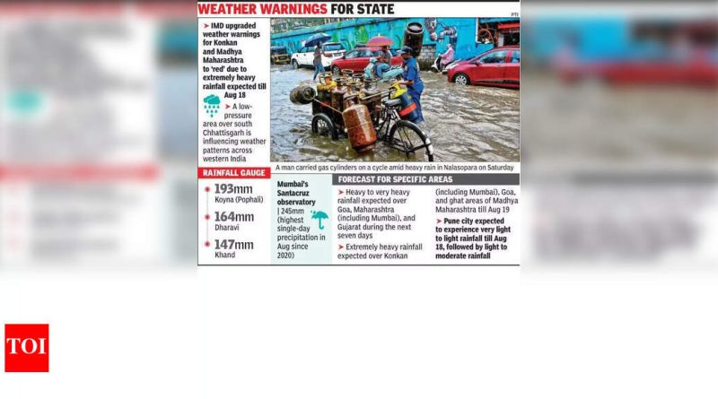 पुणे: भारत हवामान विभागाने (आयएमडी) शनिवारी कोंकण आणि मध्य महाराष्ट्राला हवामानाचा इशारा ‘लाल’ वर सुधारित केला. दक्षिण छत्तीसगडने पश्चिम भारतभरातील हवामानाच्या नमुन्यांवर कमी दबाव आणला म्हणून १ Aug ऑगस्टपर्यंत अत्यंत मुसळधार पावसाचा अंदाज लावला.शनिवारी सकाळी संपलेल्या मागील hours 48 तासांत मराठवाडाच्या अनेक भागांनी पावसाळ्याच्या दोन भागांमध्ये तीन लोकांचा मृत्यू झाला. या प्रदेशातील 80 वर्तुळात मुसळधार पाऊस पडल्यानंतर एक दिवस, मराठवाडाने शनिवारी सकाळी 24 तास संपलेल्या 24 तासांच्या कालावधीत 15 मंडळांच्या आत मोठ्या सरी मिळविली. आयएमडीच्या अधिका said ्यांनी सांगितले की सध्या दक्षिण छत्तीसगड आणि अतिपरिचित क्षेत्रावर हवामान प्रणाली पश्चिम-उत्तर-पश्चिमेकडे सरकण्याची शक्यता आहे आणि १ Aug ऑगस्टच्या सुमारास गुजरातला जाण्यापूर्वी हळूहळू कमकुवत होईल.महाराष्ट्रातील अनेक स्थानकांमध्ये अति मुसळधार पावसाची नोंद झाली असून, शनिवारी पहाटे 24 तासांत ट्रिपल-अंकी पर्जन्यवृष्टीची नोंद झाली. कोयना (पोफली) ने 193 मिमी रेकॉर्ड केले, त्यानंतर धारावी (164 मिमी) आणि खंड (147 मिमी). घाटांमधील इतर महत्त्वपूर्ण पर्जन्यमान मोजमापांमध्ये 128 मिमी येथे लोनावला (टाटा), 129 मिमी आणि डन्जरवाडी 123 मिमी येथे लोनावला (सीएफएफ) समाविष्ट आहे.“मुंबईच्या सॅन्टाक्रूझ वेधशाळेमध्ये गेल्या 24 तासांत 245 मिमी पाऊस नोंदविला गेला आणि 2020 पासून ऑगस्टमध्ये सर्वाधिक एकल-दिवसाचा पर्जन्यवृष्टी चिन्हांकित केली,” हवामान ब्लॉगच्या व्हेरीजच्या एका तज्ञाने सांगितले.पुढील सात दिवसांत गोव्यावर, महाराष्ट्र (मुंबईसह) आणि गुजरात यांच्यावर जोरदार पाऊस पडण्याचा आयएमडीचा अंदाज आहे. कोंकन (मुंबईसह), गोवा आणि घाट भागातील मध्य महाराष्ट्रातील १ Aug ऑगस्टपर्यंत जोरदार पाऊस पडला आहे.मुंबईने मुसळधार पाऊस पडला, तर पुणे सिटीने कमी पाऊस नोंदविला. शनिवारी सकाळी 8.30 ते 30.30० या वेळेत नोंदविलेल्या आयएमडीच्या आकडेवारीनुसार, पुणे ओलांडून पावसाच्या मोजमापांनी महत्त्वपूर्ण फरक दर्शविला. सर्वोच्च पर्जन्यवृष्टी गिरीव्हन (१mm मिमी) येथे नोंदविली गेली, त्यानंतर लावळे (mm मिमी), तर शिवाजीनगर सारख्या भागात ०.9 मिमीचा कमी पाऊस पडला. राजगुरुनगर, चिंचवड, पुरंदर आणि तलेगाव यासह इतर भागात प्रत्येकी ०. mm मिमी नोंद झाली.हवामानाच्या पूर्वानुमानकर्त्यांनी १ Aug ऑगस्टपर्यंत पुणे शहरासाठी अतिशय हलके ते हलके पाऊस पडण्याचा अंदाज वर्तविला होता, त्यानंतर काही दिवस प्रकाश ते मध्यम पाऊस पडला. पुण्यातील घाट भाग, तथापि, वेगळ्या ठिकाणी अत्यधिक पर्जन्यवृष्टीसह मुसळधार ते अत्यंत मुसळधार पावसासाठी लाल चेतावणीखाली आहेत.राज्य आपत्ती व्यवस्थापन विभागाने शनिवारी तातडीचे अद