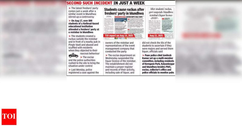 पुणे – राज्य उत्पादन शुल्क विभाग आणि शहर पोलिसांनी राजा बहादूर मिल रोडवरील पबमध्ये प्रवेश करण्याची आणि शनिवारी संध्याकाळी दारूची सेवा देण्याची परवानगी असल्याच्या आरोपाची चौकशी सुरू केली आहे.महाराष्ट्र नवनीरमॅन सेना (एमएनएस) कामगार आणि समर्थकांनी असा दावा केला की त्यांनी शहरातील तीन शैक्षणिक संस्थांमधील विद्यार्थ्यांसह असलेल्या पबमध्ये फ्रेशर्स पार्टी बंद केली आहे.पुणे अबकारी अधीक्षक अतुल कानडे यांनी रविवारी टीओआयला सांगितले की, “मध्यरात्रीच्या सुमारास घटनास्थळी गाठणारी आमची टीम पब प्रतिनिधींनी सांगितले की फ्रेशर्स पार्टी संध्याकाळी and ते रात्री between दरम्यान आयोजित केली गेली होती आणि मध्यरात्रीच्या सुमारास नियमित पार्टी चालू आहे. आत्तासाठी, आम्ही परवाना अटींच्या उल्लंघनाचा एक प्रकरण नोंदविला आहे. ” “आम्ही नोंदी एकत्रित केल्या आहेत आणि आमची टीम फ्रेशर्स पार्टीबद्दल आणि अल्पवयीन मुलांसाठी दारूची सेवा दिली गेली आहे की नाही याची माहिती शोधण्यासाठी सीसीटीव्ही कॅमेरा फुटेजमधून जात आहे. आमच्या चौकशीच्या निकालाच्या आधारे आम्ही पुढील कारवाई करू,” कानडे म्हणाले.बंड गार्डन पोलिसांचे वरिष्ठ निरीक्षक रवींद्र गायकवाड यांनी रविवारी संध्याकाळी टीओआयला सांगितले की, “आम्ही पब आणि इव्हेंट मॅनेजमेंट कंपनीच्या अधिकृत प्रतिनिधींविरूद्ध एका सार्वजनिक सेवकाच्या अधिकृत प्रतिनिधींविरूद्ध एका सार्वजनिक सेवकाने योग्यरित्या जाहीर केलेल्या आदेशाचे उल्लंघन केल्याबद्दल खटला दाखल करण्याची प्रक्रिया सुरू केली आहे. आमच्या चौकशीने या कार्यक्रमासाठी पूर्वीच्या परवानगीच्या निमित्त न घेता आयोजित केले होते. तसे, पक्ष बेकायदेशीर होता. “गायकवाड म्हणाले, “आम्ही इव्हेंट मॅनेजमेंट कंपनीची ओळख पटविली आहे, ज्याने फ्रेशर्स पार्टीचे आयोजन केले आहे परंतु आम्ही त्यांच्याशी अद्याप संपर्क साधू शकलो नाही. आम्ही लवकरच पब अधिका officials ्यांना आणि कार्यक्रम कंपनीच्या अधिका their ्यांना त्यांचे वक्तव्य नोंदविण्यासाठी कॉल करू.”टीओआयने रविवारी पबला भेट दिली आणि कर्मचार्यांशी बोलण्याचा प्रयत्न केला. तथापि, ते म्हणाले की त्यांना या विषयावर बोलण्यास अधिकृत नाही आणि त्यांनी व्यवस्थापकाचा नंबर दिला. पबच्या इव्हेंटची आवृत्ती शोधणार्या व्यवस्थापकास अनेक कॉल आणि संदेश असूनही, दाबण्यासाठी जाईपर्यंत कोणताही प्रतिसाद मिळाला नाही.या गटाचे नेतृत्व करणा the ्या या गटाचे नेतृत्व करणारे एमएनएस सिटी युनिटचे अध्यक्ष धनंजय दलवी यांनी दावा केला की या कार्यक्रमात महाविद्यालयीन विद्यार्थी, बहुतेक अल्पवयीन होते. पबने अल्कोहोलयुक्त पेयांची सेवा दिली होती, जरी पबने अल्पवयीन मुलांना प
