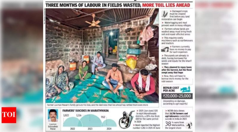 मंदार देशपांडे यांचे पिक्स भूम (धाराशिव): भूम तहसीलच्या महात्वादी गावात, 65 वर्षीय जिजबाई तिच्या दशकांच्या जुन्या घराच्या एका क्रॅक चिखलाच्या मजल्यावर बसली आणि तिच्या फिकट साडीच्या सैल टोकाने अश्रू पुसले. एका आठवड्यापूर्वी, 24 सप्टेंबर रोजी तिचा 42 वर्षांचा मुलगा लक्ष्मण बाबाशेब पवार यांनी आत्महत्या केल्याचा आरोप आहे.फक्त दीड एकर जमीन असलेल्या पवारने बांगंगाच्या पूर पाण्याने कांदा आणि सोयाबियन पीक गिळंकृत पाहिले. त्याची विहीर, त्याच्या लहान होल्डिंगची जीवनरेखा, गाळाने भरली. जिजबाई म्हणाली, “तो दोन दिवस कोणाशीही बोलला नाही आणि केवळ खाल्ले. तो म्हणत राहिला, ‘आम्ही सर्व काही गमावले आहे, आपण कसे जगू?’ “ज्या दिवशी त्याने आपले आयुष्य संपविले त्या दिवशी पवार आपल्या कुटूंबाला सांगितले की तो गुरेढोरे शेडमध्ये जात आहे. त्याने स्वत: ला तिथेच फाशी दिली.पवारांची पत्नी भाग्याश्री अजूनही धक्कादायक आहे, कुटुंबासमोरील अडचणी स्पष्ट करण्यासाठी संघर्ष करीत आहेत. “त्याने खासगी बँकांकडून कर्ज घेतले आणि दोन वर्षांपूर्वी दोन ट्रॅक्टर विकत घेतले, असा विचार केला की आमची दोन मुले कर्जाची परतफेड करण्यासाठी आणि नवीन घर बांधण्यासाठी पुरेसे पैसे कमवतील. परंतु या कर्जामुळे त्याने आपले जीवन संपवले. तो मला नेहमी विचारेल, ‘आम्ही सहा महिन्यांत १.7575 लाख रुपये कसे देऊ शकतो?’ “30 सप्टेंबर रोजी, तुळजापूर तहसील येथील आंदूर गावातील 45 वर्षीय उमेश डेपे, त्याच्या निवासस्थानी आत्महत्येने निधन झाले. डेपनेही विहीर खोदण्यासाठी आणि मोटर पंप खरेदी करण्यासाठी खासगी पैशाच्या लेक्सकडून कर्ज घेतले, फक्त त्याचे प्रयत्न पूरातून धुवून टाकण्यासाठी.दोन्ही मृत्यू वेगळ्या नाहीत. भूम, पॅरांडा आणि धारशिव जिल्ह्यातील इतर भागांच्या तहसीलमध्ये शेतकरी निराशेबद्दल उघडपणे बोलतात आणि अत्यंत पावले उचलण्याचा विचार करतात. बांगंगा आणि रामगंगा नद्यांच्या सूजलेल्या नुकत्याच झालेल्या पूरात स्थायी पिके, पशुधन आणि घरे उध्वस्त झाली आहेत. बर्याच लोकांसाठी, सरकारच्या मदत उपाय त्यांच्या वास्तविक नुकसानींपेक्षा खूपच कमी आहेत.“मी माझ्या दीड एकरात विहीर खोदण्यासाठी lakh. Lakh लाख रुपये घेतले. परंतु, पूरने माझे विहीर, माझे पिके नष्ट केली आणि माझ्या चार गायींचा मृत्यू झाला,” भूममधील सादसांगवी गावातील शेतकरी महादेव अल्डर म्हणाले. तो म्हणाला, “माझे घर दोन दिवस पाण्याखाली होते. मी माझे कपडे आणि आवश्यक वस्तू गमावल्या. मला सरकारकडून फक्त १०,००० रुपये मिळाले आहेत. मी सर्व काही पुन्हा तयार करू शकत नाही. माझ्यासारख्या शेतकर्यांनी आपले जीवन संपवण्याचा विचार का करू नये?” अल्डर मित्राकडून घेतलेल्या कपड्यांमध्ये होता. तो त्याच्या 
