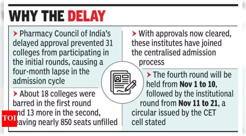 पुणे: बॅचलर इन फार्मसी प्रवेशाच्या तिसऱ्या फेरीत 38 नवीन मान्यताप्राप्त महाविद्यालयांमध्ये 2,000 अतिरिक्त जागांची भर पडल्यानंतर तब्बल 6,121 विद्यार्थ्यांना जागा वाटप करण्यात आल्या. एकूण 447 महाविद्यालयांमध्ये आता एकूण 56,000 जागांची संख्या वाढली आहे. विद्यार्थ्यांनी गुरुवारपर्यंत प्रवेश निश्चित करणे आवश्यक आहे. यापूर्वी, पहिल्या दोन फेऱ्यांमध्ये २४,१८६ विद्यार्थ्यांनी जागा मिळवल्या होत्या. सुमारे 14,000 जागा रिक्त राहिल्या असून त्या पुढील दोन फेऱ्यांमध्ये भरल्या जातील. नव्याने मान्यताप्राप्त महाविद्यालयांनी विद्यार्थ्यांची नोंदणी सुरू केल्यावर रिक्त जागा लक्षणीयरीत्या कमी होतील अशी अधिकाऱ्यांची अपेक्षा आहे. सीईटी सेलच्या एका वरिष्ठ अधिकाऱ्याने सांगितले की, “38 महाविद्यालयांच्या समावेशामुळे प्रवेशाचा विस्तार झाला आहे आणि विद्यार्थ्यांसाठी नवीन संधी उघडल्या आहेत, विशेषत: ग्रामीण जिल्ह्य़ांमध्ये जेथे पूर्वी पर्याय मर्यादित होते,” असे सीईटी सेलच्या एका वरिष्ठ अधिकाऱ्याने सांगितले.मान्यतेच्या विलंबामुळे शैक्षणिक कॅलेंडर विस्कळीत झाल्याचे तज्ज्ञांनी सांगितले. “यंदाच्या प्रदीर्घ प्रवेशाच्या वेळापत्रकामुळे शैक्षणिक नियोजनावर ताण आला आहे. पण नवीन फेरीत पूर्वी बाहेर पडलेल्या विद्यार्थ्यांना चांगली संधी मिळेल,” असे नाशिकस्थित फार्मसी कॉलेजचे प्राचार्य संदीप पाटील यांनी सांगितले.सीईटी सेलने महाविद्यालयांना विलंब टाळण्यासाठी वेळापत्रकानुसार कागदपत्र पडताळणी आणि प्रवेश निश्चिती पूर्ण करण्याचे निर्देश दिले आहेत. प्रवेश प्रक्रियेत सहभागी असलेल्या एका अधिकाऱ्याने सांगितले की, “ही फेरी विद्यार्थ्यांसाठी महत्त्वपूर्ण आहे कारण अनेक नवीन जोडलेली महाविद्यालये नवीन पर्याय देतात, विशेषत: ज्या प्रदेशांमध्ये पूर्वी जागा उपलब्ध नसल्या होत्या,”विलंब का फार्मसी कौन्सिल ऑफ इंडियाच्या विलंबित मान्यतेमुळे 31 महाविद्यालयांना सुरुवातीच्या फेरीत सहभागी होण्यापासून रोखले गेले, ज्यामुळे प्रवेश चक्रात चार महिन्यांचा विलंब झाला.पहिल्या फेरीत सुमारे 18 महाविद्यालये आणि दुसऱ्या फेरीत आणखी 13 महाविद्यालयांना प्रवेशबंदी करण्यात आली, त्यामुळे जवळपास 850 जागा रिक्त राहिल्या.आता मान्यता मिळाल्याने या संस्था केंद्रीकृत प्रवेश प्रक्रियेत सामील झाल्या आहेतचौथी फेरी 1 ते 10 नोव्हेंबर, त्यानंतर 11 ते 21 नोव्हेंबर दरम्यान संस्थात्मक फेरी होईल, असे सीईटी सेलने जारी केलेल्या परिपत्रकात म्हटले आहे.