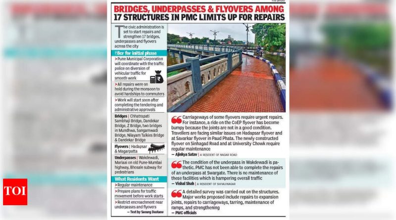 पुणे : शहरातील १७ पूल, अंडरपास आणि उड्डाणपुलांची दुरुस्ती आणि मजबुतीकरण नागरी प्रशासन पुन्हा सुरू करण्याच्या तयारीत आहे. पुणे महानगरपालिकेने सुरुवातीच्या टप्प्यासाठी 8 कोटी रुपये राखून ठेवले आहेत आणि सुरळीत कामासाठी वाहनांची वाहतूक वळवण्यासाठी वाहतूक पोलिसांशी समन्वय साधणार आहे.प्रवाशांना त्रास होऊ नये म्हणून पावसाळ्यात सर्व दुरुस्तीचे काम रखडले होते. निविदा आणि प्रशासकीय मान्यता पूर्ण झाल्यानंतर लवकरच काम सुरू होईल.पुलांमध्ये छत्रपती संभाजी पूल, दांडेकर पूल, झेड ब्रिज, मुंढव्यातील दोन पूल, संगमवाडी पूल, निलायम टॉकीज पूल आणि दांडेकर पूल, हडपसर आणि मगरपट्टा हे उड्डाणपूल आणि जुन्या पुणे-मुंबई महामार्गावरील वाकडेवाडी, मरियाई, भोसले उपनगरातील भुयारी पूल यांचा समावेश आहे.नगर रोडचे रहिवासी अजिंक्य सातव म्हणाले की, काही उड्डाणपुलांच्या कॅरेजवेची तातडीने दुरुस्ती करणे आवश्यक आहे. “उदाहरणार्थ, सांधे चांगल्या स्थितीत नसल्यामुळे CoEP उड्डाणपुलावरील राइड खडबडीत झाली आहे. हडपसर उड्डाणपुलावर आणि पौड फाटा येथील सावरकर उड्डाणपुलावर प्रवाशांना अशाच समस्यांना तोंड द्यावे लागत आहे. सिंहगड रोडवर आणि विद्यापीठ चौकात नव्याने बांधण्यात आलेल्या उड्डाणपुलाची नियमित देखभाल करणे आवश्यक आहे,” ते पुढे म्हणाले.वाकडेवाडीतील अंडरपासची अवस्था दयनीय असल्याचे शिवाजीनगर येथील रहिवासी विशाल शहा यांनी सांगितले. “पीएमसी स्वारगेट येथील अंडरपासची दुरुस्ती पूर्ण करू शकलेली नाही. या सुविधांची कोणतीही देखभाल केली जात नाही ज्यामुळे एकूण वाहतुकीला अडथळा येत आहे,” ते पुढे म्हणाले.PMC अधिकाऱ्यांनी सांगितले की, संरचनेचे तपशीलवार सर्वेक्षण करण्यात आले आणि प्रस्तावित केलेल्या प्रमुख कामांमध्ये विस्तारित जोडांची दुरुस्ती, कॅरेजवेची दुरुस्ती, डांबरीकरण, रॅम्पची देखभाल आणि मजबुतीकरण यांचा समावेश आहे.रहिवाशांना काय हवे आहेनियमित देखभालकाम सुरू होण्यापूर्वी रहदारीच्या हालचालीसाठी योजना तयार कराअंडरपास आणि उड्डाणपुलांजवळील अतिक्रमणांना प्रतिबंध करा