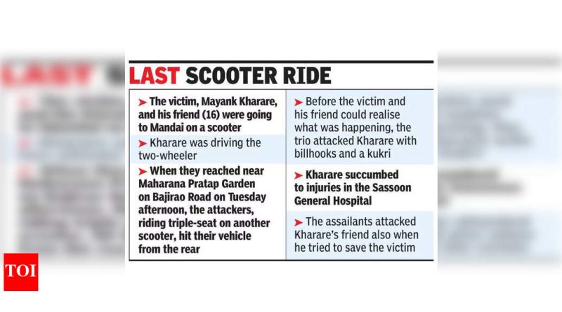 पुणे : बाजीराव रोडवरील महाराणा प्रताप गार्डनजवळ मंगळवारी दुपारी ३.१५ च्या सुमारास तीन अल्पवयीन मुलांनी आंबील ओढा वसाहत येथील १७ वर्षीय तरुणाचा सार्वजनिक ठिकाणी बिलहुक आणि कुकरीने वार करून खून केला.खडक पोलिसांनी नंतर हल्लेखोरांना ताब्यात घेतले, सर्व 16-17 वर्षे वयोगटातील अल्पवयीन. जुन्या वैमनस्यातून ही हत्या झाल्याचे पोलिसांनी सांगितले.खडक पोलिसांचे वरिष्ठ निरीक्षक शशिकांत चव्हाण म्हणाले, “पीडित तरुण मयंक खरारे आणि त्याचा मित्र (१६) हे स्कूटरवरून मंडईकडे जात होते. खरारे गाडी चालवत होते. ते बागेजवळ आले असता स्कूटरवर ट्रिपल सीट बसलेल्या हल्लेखोरांनी त्यांच्या वाहनाला मागून धडक दिली. पीडित तरुणी आणि त्याच्या मित्राला काय चालले आहे हे समजण्यापूर्वीच या तिघांनी खरारे यांच्यावर बिल्क आणि कुकरीने हल्ला करण्यास सुरुवात केली. पीडितेच्या मानेवर, चेहऱ्यावर आणि गळ्यावर वार करण्यात आले. खरारे यांच्या मित्राने पीडितेला वाचवण्याचा प्रयत्न केला असता हल्लेखोरांनी त्यांच्यावर हल्ला केला.या हल्ल्याने व्यस्त मार्गावर घबराट पसरली आणि कोंढव्यातील येवलेवाडी येथे 1 नोव्हेंबर रोजी अशाच एका ऑटोरिक्षा चालकाचा दिवसाढवळ्या खून करण्यात आला – टोळीतील शत्रुत्वाचा परिणाम. ताज्या हत्येने शहरातील कायदा आणि सुव्यवस्थेवर प्रश्नचिन्ह निर्माण केले, विशेषत: 5 सप्टेंबर रोजी आयुष कोमकरच्या हत्येनंतर पुन्हा टोळीतील वादातून निर्माण झाला.खरारे यांच्या मित्राच्या उजव्या खांद्यावर व उजव्या गालाला दुखापत झाली. त्यांनी नंतर पोलिसांकडे तक्रार दाखल केली आणि हल्लेखोरांची ओळख पटवली, ज्या परिसरात पीडिता राहत होती. या तपशिलांच्या आधारे पोलिसांनी हल्लेखोरांचा शोध घेऊन त्यांना ताब्यात घेतले.अधिकाऱ्याने सांगितले की, पीडितेचा मित्र घाबरला होता आणि त्याने पळून स्वतःला वाचवण्यात यश मिळवले. नंतर त्याने मित्रांना बोलावले आणि नंतर पोलिस ठाण्यात गेले.“एक टीम तात्काळ घटनास्थळी पाठवण्यात आली. तोपर्यंत खरारेचे नातेवाईकही तिथे पोहोचले. आम्ही त्याला ससून जनरल हॉस्पिटलमध्ये नेले, तिथे त्याचा मृत्यू झाला,” असे अधिकारी म्हणाले.सहाय्यक पोलिस आयुक्त (फरासखाना विभाग) अनुजा देशमाने यांनी TOI ला सांगितले की, पीडितेच्या मित्राने दिलेल्या प्रत्यक्षदर्शी साक्षीदाराच्या आधारे हल्लेखोरांची ओळख पटली. देशमाने म्हणाले, “तिघे अल्पवयीन आणि शाळा सोडलेले आहेत.”ती म्हणाली की पीडित मुलगी देखील शाळा सोडली होती. “पीडित आणि आरोपी यांच्यातील जुन्या वादातून हा हल्ला झाला आहे. आमचा तपास सुरू आहे,” ती म्हणाली.