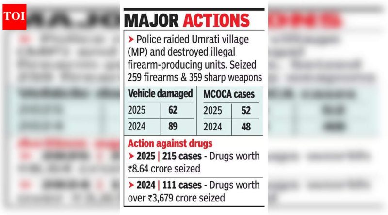 सोन्याच्या वाढत्या किमतींमुळे चेन स्नॅचिंग आणि घरफोड्यांमध्ये वाढ झाली आहे का, असे विचारले असता कुमार म्हणाले, “आम्ही त्यावर विशेष भाष्य करू शकत नाही. सर्व प्रकरणे तत्काळ आणि पक्षपात न करता नोंदवण्यात आली.” सक्रिय उपायांवर प्रकाश टाकताना, कुमार म्हणाले, “दृश्यमान पोलिसिंग आणि विस्तारित सीसीटीव्ही नेटवर्कमुळे गुन्हेगारीला आळा घालण्यास मदत झाली. आम्ही गुन्हेगारांचा ऑनलाइन माग काढण्यासाठी तंत्रज्ञानाचा वापर केला आणि त्यांच्या निवासस्थानी नियमित तपासणी केली.”बसेस किंवा रस्त्यावरील इतर चोरीच्या घटनांमध्येही घट झाली आहे. 2025 मध्ये पोलिसांनी 1,143 इतर चोरीच्या घटना नोंदवल्या, तर 2024 मध्ये पोलिसांनी अशा 1,522 गुन्ह्यांची नोंद केली. ते म्हणाले, “आम्ही 12.71 कोटी रुपयांची चोरीची मालमत्ता जप्त केली, जी 2024 मध्ये 8.79 कोटी रुपयांची होती.”फसवणूक प्रकरणे, जी 2024 मध्ये 1,813 होती, ती 2025 मध्ये 1,459 वर घसरली. “ही घट गुंतवणूक सेमिनार आणि मल्टी-लेव्हल मार्केटिंग इव्हेंट्सवर देखरेख करण्यासह वेळेवर हस्तक्षेप केल्यानंतर,” कुमार म्हणाले.खुनाच्या गुन्ह्यांच्या संख्येबाबत पोलीस आयुक्त म्हणाले: “आम्ही या प्रकरणांमध्ये सहभागी असलेल्या आंदेकर टोळीच्या सदस्यांवर कठोर कारवाई केली.” पोलिसांनी 110 ज्ञात गुन्हेगारांवर MPDA आरोप लावले, गेल्या वर्षी 95 वरून, आणि चार प्रमुख टोळ्यांवर कारवाई केली — आंदेकर, घायवळ, मारणे आणि टिपू पठाण — मालमत्ता जप्त करून, बेकायदेशीर बांधकामे पाडून, सदस्यांना अटक करून आणि स्वतंत्र MCOCA खटले दाखल करून.ग्राफिकप्रमुख क्रियामध्य प्रदेशातील उमराटी गावात पोलिसांनी छापा टाकून बेकायदेशीर बंदुक बनवणारे युनिट उद्ध्वस्त केले.पोलिसांनी 259 बंदुक जप्त केली.पोलिसांनी 359 धारदार शस्त्रे जप्त केली.वाहन तोडफोड प्रकरणांची संख्या2025 – 62 2024 – 89MCOCA प्रकरणांची संख्या2025 – 52 2024 – 48ड्रग्ज विरुद्ध कारवाई2025 – 215 प्रकरणे – 8.64 कोटी रुपयांची औषधे जप्त 2024 – 111 प्रकरणे – 3679 कोटी रुपयांची औषधे जप्त