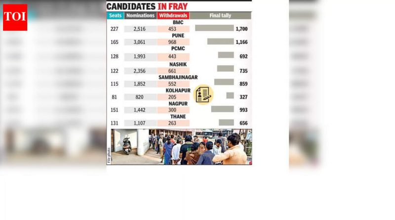 सुरुवातीला एकूण 33,427 उमेदवारी अर्ज दाखल झाले होते. त्यापैकी 24,771 वैध घोषित करण्यात आले. तब्बल 8,840 उमेदवारांनी अर्ज मागे घेतले.राज्य निवडणूक आयोगाच्या (एसईसी) वरिष्ठ अधिकाऱ्याने सांगितले की, “सर्व महापालिकांकडून डेटा मागवण्यात आला होता. त्यानंतर, अंतिम टॅली एकत्रित करण्यात आली होती,” असे राज्य निवडणूक आयोगाच्या (एसईसी) वरिष्ठ अधिकाऱ्याने सांगितले.“छाननी आणि माघार घेण्याची प्रक्रिया हे सुनिश्चित करते की केवळ पात्र उमेदवारच रिंगणात राहतील. हे राजकीय पक्ष आणि अपक्षांना निवडणुकीपूर्वी रणनीती अंतिम करण्यास अनुमती देते,” ते म्हणाले.बृहन्मुंबई महानगरपालिकेत (BMC) 227 जागांसाठी तब्बल 2,516 उमेदवारी अर्ज दाखल झाले होते. त्यापैकी एकूण 2,153 वैध ठरले. 453 माघारीनंतर 1,700 उमेदवार रिंगणात राहिले आहेत.पुण्यात 165 जागांसाठी 3,061 अर्ज दाखल झाले आहेत. त्यापैकी तब्बल 2,134 अर्ज वैध ठरले. 968 माघारीनंतर 1,166 उमेदवार निवडणूक रिंगणात राहिले आहेत.पिंपरी चिंच महापालिका (पीसीएमसी) निवडणूक जिंकण्यासाठीही चुरशीची स्पर्धा होणार आहे. तेथे तब्बल 1,993 उमेदवारी अर्ज दाखल झाले. अखेर 128 जागांसाठी 692 उमेदवार रिंगणात आहेत.इतर महत्त्वाच्या महापालिकांमध्ये नाशिकचा समावेश होतो. तेथे तब्बल 2,356 उमेदवारी अर्ज दाखल झाले. अखेर माघार घेतल्यानंतर ७३५ उमेदवार निवडणूक लढवणार आहेत.छत्रपती संभाजीनगरमध्ये 115 नगरसेवकांच्या जागांसाठी 859 उमेदवार आहेत. कोल्हापुरात 81 जागांसाठी तब्बल 327 उमेदवार रिंगणात आहेत.नागपुरातील १५१ जागांसाठी ९९३ उमेदवार रिंगणात आहेत. ठाण्यात 131 जागांसाठी एकूण 656 उमेदवार रिंगणात आहेत.489 उमेदवारांसह कल्याण-डोंबिवली, 432 उमेदवारांसह उल्हासनगर आणि 435 उमेदवारांसह मीरा-भाईंदरमध्येही चुरशीची लढत होणार आहे. इचलकरंजी (२३०), पनवेल (२५५) आणि मालेगाव (३०१) या छोट्या महानगरपालिकांमध्येही बहुकोरी लढती होणार आहेत.उमेदवारांची यादी अंतिम झाल्यामुळे, 15 जानेवारी रोजी होणाऱ्या निवडणुकीचा प्रचार राज्यभरात तीव्र होण्याची अपेक्षा आहे. विशेषत: पुणे, नाशिक, नागपूर आणि छत्रपती संभाजीनगर यांसारख्या शहरांमध्ये रस्ते, पाणीपुरवठा, स्वच्छता आणि नागरी पायाभूत सुविधांसारख्या स्थानिक समस्यांकडे मतदारांचे लक्ष वेधण्याची शक्यता आहे, असे राजकीय तज्ज्ञांनी सांगितले.